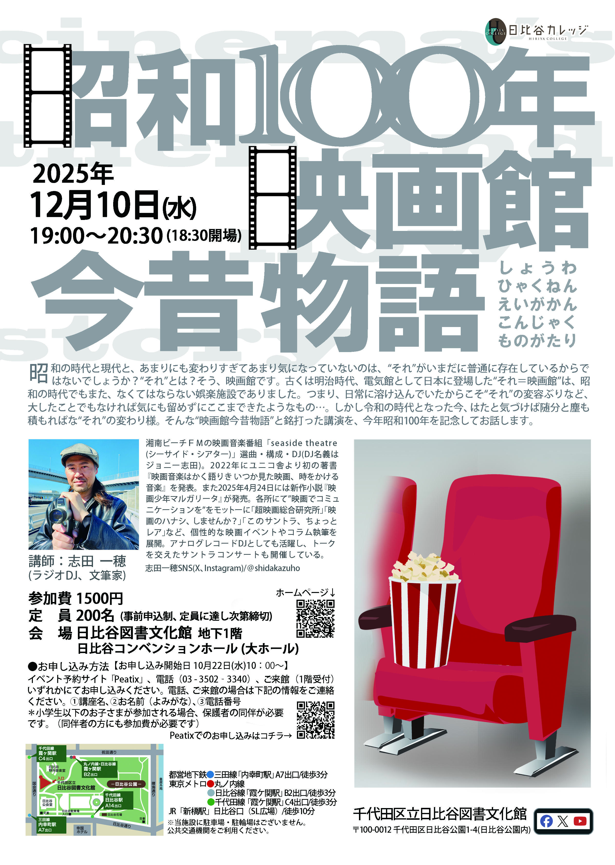 昭和の時代と現代と、あまりにも変わりすぎてあまり気になっていないのは、"それ"がいまだに普通に存在しているからではないでしょうか? "それ"とは? そう、映画館です。古くは明治時代、電気館として日本に登場した"それ=映画館"は、昭和の時代でもまた、なくてはならない娯楽施設でありました。つまり、日常に溶け込んでいたからこそ"それ"の変容ぶりなど、大したことでもなければ気に留めずにここまできたようなもの...。しかし令和の時代となった今、はたと気づけば随分と塵も積もれば"それ"な変わり様。そんな"映画館今昔物語"と釘打った講演を、今年昭和100年を記念してお話しします。