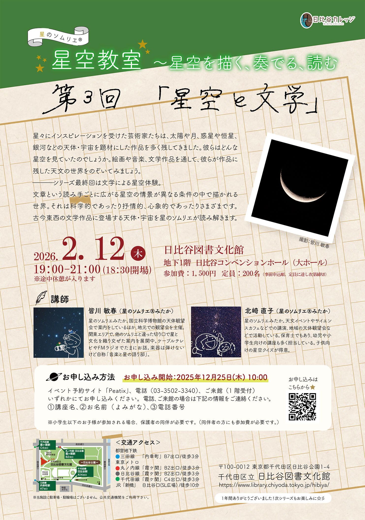 シリーズ最終回は文学による星空体験。文章という読み手ごとに広がる星空の情景が異なる条件の中で描かれる世界。それは科学的であったり抒情的、心象的であったりさまざまです。古今東西の文学作品に登場する天体・宇宙を星のソムリエが読み解きます。