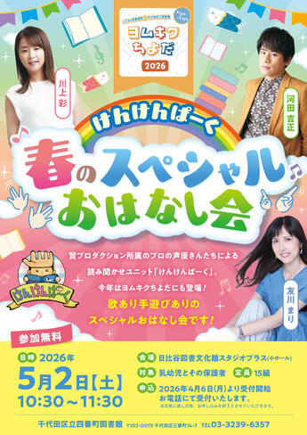 アニメや映画などで活躍する賢プロダクション所属の声優さんの読み聞かせ隊「けんけんぱーく」による、歌や遊びを交えた楽しいスペシャルなおはなし会です。ぜひ、ご参加ください。