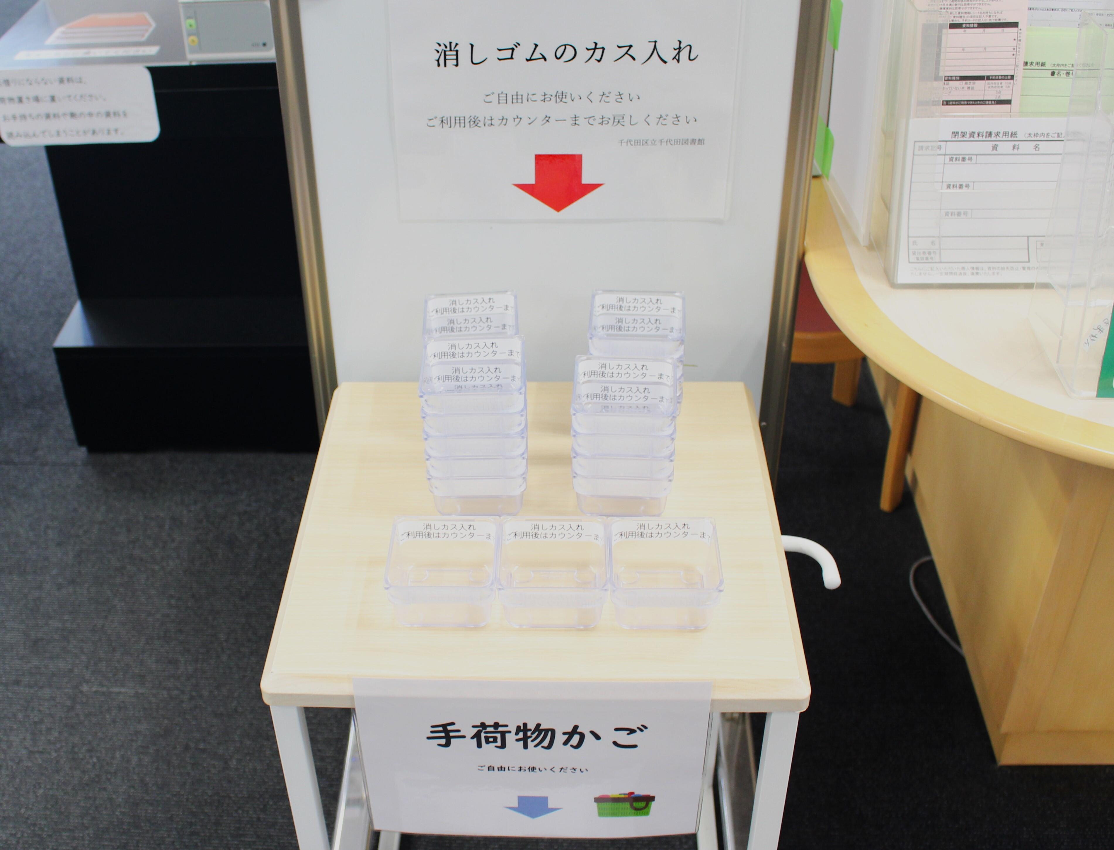 千代田図書館9階に、消しゴムのカスを入れるための箱をご用意しました。ご自由にお使いください。